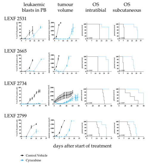 Cytarabine as a first line treatment in acute leukaemia was tested in four PDX models implanted i.t. and s.c., respectively. The antitumoral activity was determined by OS and percentage of human CD45+ cells in PB (i.t.) and absolute tumour volume in mm ³ (s.c.). Overall, cytarabine showed statistically significant activity in all four models independent of the injection route. The optimal test/control (T/C) values and their statistical significance of an individual model were similar between the two experimental set-ups (Figure 6). Nevertheless, when comparing the influence of the treatment on OS, only LEXF 2799 showed analogous growth kinetics. Cytarabine induced a 1.6fold increase in OS in the i.t. as well as the s.c. experiment. In LEXF 2665 (3.29fold vs 1.94fold) and LEXF 2531 (3.75fold vs 1.72fold) the prolongation of OS was more pronounced in the s.c. setting. In contrast, animal bearing LEXF 2734 in a disseminated mode benefit more from the treatment with cytarabine as mice bearing the same tumour model s.c. (1.84 fold vs complete remission). In the respective donor patients of the leukaemia PDX models cytarabine achieved a complete remission in the course of the first line treatment. Three of four patients underwent a relapse and received additional therapies during the course of their disease. Thus, despite the minor differences in the duration of the antitumoral effect, the models reflected the clinical response of the donor patient regardless of the implantation site.