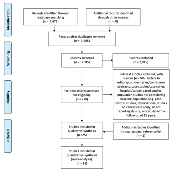 We identified 4675 articles, and 3685 of them remained after the exclusion of duplicates. Among them, we identified 770 articles dealing with PAC. After application of inclusion–exclusion criteria, 23 articles were selected. From the reference list of the selected papers, we found another article [4]. Of the 24 papers included in the review, 11 considered all types of tumors and 13 dealt with one specific type of cancer (Figure 1).