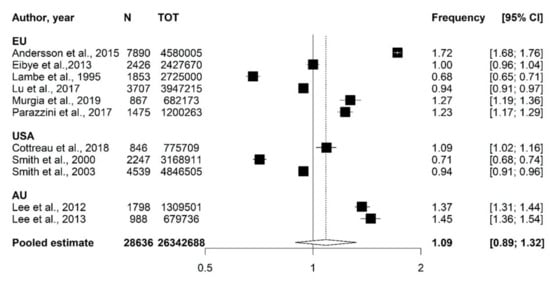Most of the studies on PACs reported the most frequent types of tumor [2,3,4,5,14,18,20,21,22,23,24] (Table S1). In a Swedish study, the most common tumors were breast, melanoma and cervical cancer. In a Danish study, melanoma ranked first, followed by cervical and breast cancer. Italian studies reported breast and thyroid as the most common cancer types, followed by skin cancer [23] or lymphoma [24]. In the studies for the USA, the two most frequent tumors were breast and thyroid cancer, followed by cervical cancer [4,5] or melanoma [14]. In the Australian ones, the most common cancer was melanoma, followed by breast and thyroid/endocrine tumors.