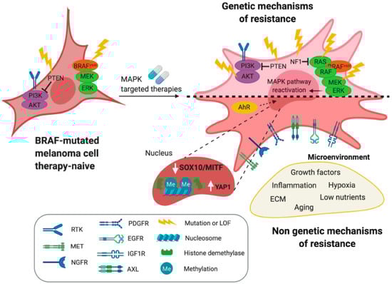 Mechanisms of resistance to mitogen-activated protein kinase (MAPK)-targeted therapies in melanoma. Melanoma cells evade targeted therapies by acquiring additional genetic alterations or through non-genetic mechanisms. LOF: loss of function; MEK: mitogen-activated protein kinase kinase; ERK: extracellular signal-regulated kinase; NF1: neurofibromatosis 1; RTK: receptor tyrosine kinase; MET: hepatocyte growth factor receptor; NGFR: nerve growth factor receptor; PDGFR: platelet derived growth factor receptor; EGFR: epidermal growth factor receptor; IGF1R: insulin-like growth factor 1 receptor; AXL: AXL receptor tyrosine kinase; PTEN: phosphatase and Tensin homolog; PI3K: phosphoinositide 3-kinase; MITF: microphthalmia-associated transcription factor; SOX10: SRY-box transcription Factor 10 (SOX10); YAP1: Yes-associated protein 1; AhR: aryl hydrocarbon receptor.