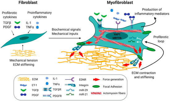 Differentiation of fibroblasts into myofibroblasts is commonly viewed as a key event in the process of wound healing and tissue repair. The high contractile force that is generated by myofibroblasts is of pivotal importance for physiological tissue remodeling [56,57,58]. General hallmarks of myofibroblasts include a contractile cytoskeleton, linked to a high responsiveness to mechanical stimuli from the microenvironment; the ability to secrete and remodel the extracellular matrix (ECM); invasive properties; and the regulation of the inflammatory response (Figure 2). The contractile function of myofibroblasts relies on the assembly of focal adhesions [59] linked to integrin- and protease-dependent remodeling of the ECM. Focal adhesions are generated by the intracellular tension exerted by the actomyosin cytoskeleton and allow the transmission of intracellular forces to the ECM [58,60]. In addition, focal adhesions constitute a scaffold for signaling molecules, playing a role in the conversion of mechanical into biochemical signals, a process called mechanotransduction [61], which involves the actin-binding coactivator of transcription myocardin related transcription factor A (MRTFA) [62] and the Hippo pathway transcriptional effector YAP1 [63,64]. Nuclear translocation of MRTFA upon globular actin polymerization induces serum response factor (SRF)-mediated transcription of genes that regulate actin dynamics [62]. MRTFA role as a molecular linker between mechanical cues and myofibroblasts activation has been shown in scleroderma [65], lung fibrosis [66,67], and in the fibrotic response to myocardial infarction [68]. The contractile nature of the myofibroblast cytoskeleton is also of crucial importance in the remodeling of the ECM. This, together with the feature of ECM synthesis and degradation make myofibroblasts the main regulators of connective tissue remodeling during the physiological process of tissue repair [69].