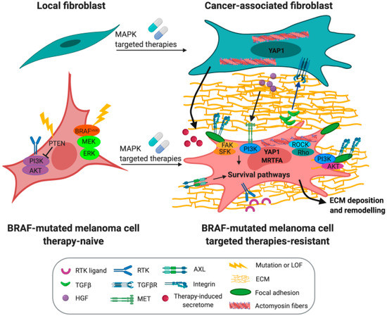 Tumor plasticity consists of a series of genetic events and signaling adaptations that mediate escape from therapies. In recent years, the effect of targeted therapies on the contribution of melanoma cells to the fibrotic rewiring of the tumor microenvironment has been recognized. In addition, several studies support the notion that MAPK inhibitor treatment in BRAF mutant melanoma actually promotes the reprogramming of melanoma cells towards a CAF/myofibroblast-like phenotype that is a source of drug resistance and tumor progression (Figure 3). The study from Fedorenko et al. [91] showed that PTEN-null melanoma cells, after short-term BRAF inhibition, display perturbation in fibronectin-mediated adhesion signaling. BRAF inhibition in fact induces the formation (by melanoma cells) of a fibronectin-derived protective niche that activates signaling from α5β1 integrin/PI3K/AKT leading to an increase in the expression of the pro-survival myeloid cell leukemia 1 (MCL1) protein that mediates therapeutic escape. Globally, these perturbations induced during the short-term adaptation to BRAF inhibition, allow a small population of cells to escape therapies through increased PI3K/MAPK signaling. This pool of cells will then acquire secondary mutations to sustain tumor growth despite the therapeutic treatment. Importantly, a connection between PTEN loss and an increased deposition of fibronectin has been evidenced also in other systems and it is a feature of pathological fibrotic states, pointing out the close connection between a fibrotic-like stroma and resistance to treatment.