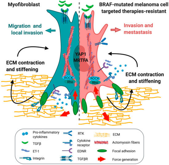 Comparison of the features of a myofibroblast and a targeted therapy-resistant melanoma cell. Schematic depiction of the reprogramming of melanoma cells toward a myofibroblast-like phenotype. TGFβ: transforming growth factor beta; ET-1: endothelin 1; RTK: receptor tyrosine kinase; EDNR: endothelin receptor; TGFβR: transforming growth factor beta receptor; ECM: extracellular matrix; YAP1: Yes-associated protein 1; MRTFA: myocardin-related transcription factor A; ROCK: Rho-associated protein kinase.