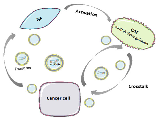 miRNAs play key role in the communication among normal fibroblasts (NFs), cancer associated fibroblast (CAFs), and cancer cells.