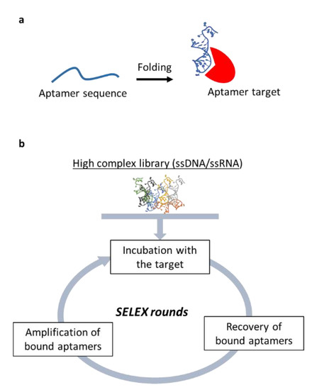 Nucleic acid-based aptamers. (a) Schematic representation of aptamer-target binding that depends on aptamer folding. (b) The SELEX (Systematic Evolution of Ligands by EXponential enrichment) process permits to select aptamers from high complex library of a random oligonucleotides through repeated rounds of binding, partitioning, and amplification of bound oligonucleotides.