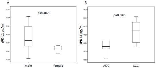 Figure 1. Box plots for sPD-L1 according to gender (female vs. male) and tumor histotypes (squamous cell carcinoma compared to adenocarcinoma; ADC vs. SCC). In the first case (A), the median values of sPD-L1 showed a trend towards statistical significance (24.98 vs 32.55 pg/mL), while the significant difference was confirmed for histology (45.28 vs. 25.68 pg/mL; (B)).