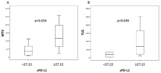 Figure 2. Box plots for MTV (A) and TLG (B) in patients with low or high sPD-L1 levels at baseline documenting a significant difference in median values: MTV, 115.3 vs. 35.5 and TLG, 687 vs. 210.1.
