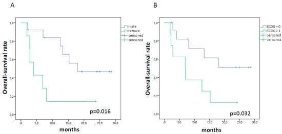 Figure 3. Kaplan Meier curves for OS in female patients ((A); 4 vs. 18 months, p = 0.016) and in those with ECOG score at baseline ≥ 1 ((B); 6.9 vs. median not reached, p = 0.032).