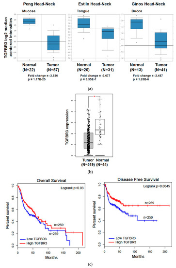 To investigate whether TGFBR3 expression was dysregulated in oral cancer specimens, we first performed an in silico analysis by using publicly available gene expression datasets for HNC from Oncomine and The Cancer Genome Atlas (TCGA). Oral cancer is a subtype of HNC. Through the analysis of three studies [26,27,28], the expression of TGFBR3 mRNA was 3.836-fold lower in oral cancer tissues than that in the normal oral mucosa (p = 1.17 × 10−25), 3.677-fold lower in tongue cancer tissues than that in healthy tongues (p = 3.35 × 10−7), and 2.487-fold lower in HNC tissues than that in the normal buccal mucosa (p = 1.28 × 10−6) (Figure 1a). Further analysis of the TCGA data by Gene Expression Profiling Interactive Analysis (GEPIA) [29] showed a decrease in TGFBR3 mRNA expression in HNC compared to healthy tissues (Figure 1b). This low TGFBR3 mRNA expression was associated with poor overall and disease-free survival among these patients (Figure 1c), suggesting a critical role of TGFBR3 in the pathogenesis of HNC.