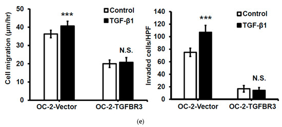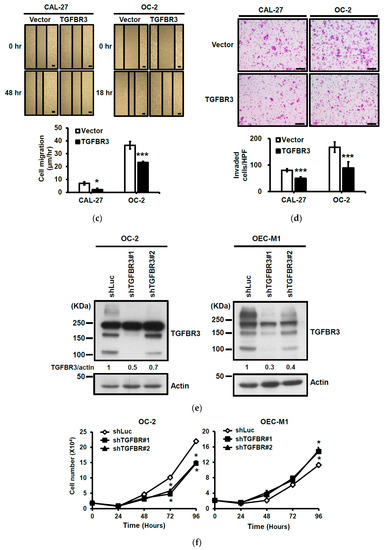 In an effort to elucidate the mechanism underlying the down-regulation of TGFBR3 in oral cancer cells, we identified an inverse relationship between the expression of TGFB1 and TGFBR3 using the TCGA-HNC database. Indeed, TGF-β1 treatments of OC-2 oral cancer cells significantly decreased TGFBR3 mRNA and protein abundance and promoted cell migration and invasion. These observations are significant because an increase of TGF-β1 expression was frequently detected in many human cancer types, including oral cancer, and its increase correlated with cancer invasiveness, metastasis, and a poor prognosis [35]. Furthermore, overexpression of TGFBR3 reduced the activation of TGF-β1-mediated SMAD signaling and aggressive cell behaviors in OC-2 oral cancer cells (Figure 4c,d). These results support the notion that while TGFBR3 is essential for TGF-β signaling, it is also a critical component of a negative-feedback loop for canonical TGF-β signaling to ensure a proper amplitude of the signaling.