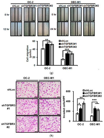 The effect of TGFBR3 on oral cancer cell behaviors. (a) CAL-27 or OC-2 cells were infected with lentiviruses bearing empty vector or FLAG-tagged TGFBR3 followed by Western blot analysis. The blot is a representative of three independent experiments. Actin was used as a loading control. These cells were further subjected to cell proliferation (b), wound repair (c), and Matrigel invasion, scale bar: 200 μm. (d) assays. Scale bar: 200 μm. (e) OC-2 or OEC-M1 were infected with lentiviruses bearing shLuc or shTGFBR3 (clone #1 or #2) to deplete TGFBR3 expression in the cells. The blot is a representative of three independent experiments. Actin was used as a loading control. (f) The numbers of the viable transfected cells were enumerated by cell proliferation assay. Cell migration, scale bar: 200 μm (g) and invasion Scale bar 200 μm (h) were measured, respectively, by wound repair and Matrigel invasion assays. All data are representatives of two-three independent experiments, each performed in triplicates. * p < 0.05, ** p < 0.01, *** p < 0.001 or N.S. (not significant) versus control or in the indicated group. Student’s t-test. The uncropped blots with molecular weight markers for Figure 2a,e are, respectively, shown in Figures S9 and S10.