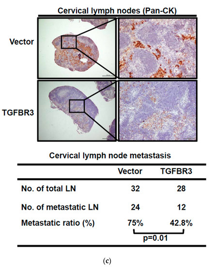 To investigate the effect of TGFBR3 expression on xenograft tumorigenesis, we subcutaneously injected vector or TGFBR3-expressing cells onto male nude mice. Interestingly, neither the primary tumor growth nor the final tumor weight were affected by TGFBR3 overexpression (Figure 3a,b). To test whether TGFBR3 overexpression affects tumor metastasis, we injected the mice intrabuccally with vector- or TGFBR3-expressing OC-2 cells. The cervical lymph nodes were collected at endpoints and immunostained with pan-cytokeratin (Pan-CK) antibodies to detect tumor cell-positive lymph nodes. We found that overexpression of TGFBR3 decreased metastasis of cervical lymph nodes (Figure 3c).