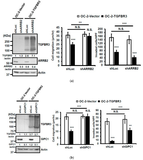 GIPC1 scaffolding protein functioned in the same signaling axis as TGBFR3-mediated suppression. (a,b) Left: Western blot analysis of ARRB2 (a) or GIPC1 (b) and TGFBR3 protein levels. Actin was used as a loading control. Right: The effects of shGIPIC1 (a) or shARRB2 (b) on TGFBR3-dependent suppressive effects on OC-2 cells. Data are presented as mean ± SD. (c,d) Similar experiments were performed as a–b, except that CAL-27 cells were analyzed. (e) Kaplan–Meier analysis shows a correlation of overall survival with the expression of GIPC1 (left) and GIPC1/TGFBR3 (right) in the TCGA-HNC dataset. The concordant decrease of both TGFBR3 and GIPC1 expression in these patients had reduced overall survival relative to those with both high expressions (p = 0.007). ** p < 0.01, *** p < 0.001 or N.S. (not significant) versus vector; Student’s t-test. All the uncropped blots with molecular weight markers for Figure 5a–d are shown in Figures S14–S17.