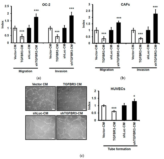 TGF-β is a pleiotropic growth factor affecting both tumor and stromal cells in tumorigenesis [34]. We further examined the paracrine effect of CM derived from TGFBR3-manipulated oral cancer cells on cancer cells, CAFs, and ECs. We observed that CM collected from TGFBR3-overexpressing OC-2 cells decreased migration and invasion of OC-2 cells (Figure 6a) and CAFs isolated from oral cancer specimens (Figures S5 and S20 and Figure 6b), and inhibited tube formation of human umbilical vein ECs (HUVECs) (Figure 6c), without affecting proliferation of CAFs or ECs (Figure S6). Conversely, CM collected from TGFBR3 knockdown cells had the opposite effects on stromal cells (Figure 6a–c).