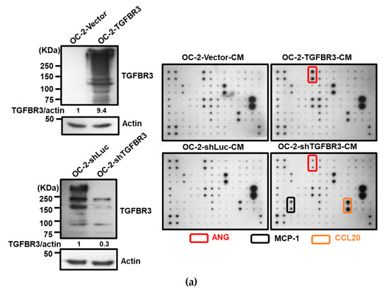 We noted that CM derived from TGFBR3-overexpressed OC-2 cells inhibits tube formation of HUVECs. This result is in contrast to the observation that ANG, induced by TGFBR3, potently promotes angiogenesis. We hypothesize that other cytokines, whose expression is regulated by TGFBR3 manipulation, override ANG’s angiogenic activity. For example, both MCP-1 and CCL20 are powerful angiogenic factors [46,47] and are significantly down-regulated by TGFBR3 overexpression. Furthermore, other secreted TGFBR3-regulated molecules not included in the array may promote CM’s anti-cancer activity.