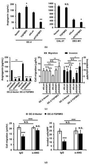 The following are available online at https://www.mdpi.com/2072-6694/12/6/1375/s1, Table S1: List of primers for PCR and the mutation, Table S2. Clinicopathologic characteristics of 86 oral cancer patients in NCKU cohort, Table S3. shRNA clones used in the gene silencing experiments, Figure S1: The decrease of TGFBR3 protein expression in oral cancer relative to adjacent normal tissue, Figure S2: Differential expression of TGFBR3 and SMAD proteins in oral cancer cells, Figure S3: A summary of genetic alterations of TGFBR3 gene in HNC patients, Figure S4: The impact of ARRB2 mRNA expression or its relation with TGFRB3 on the clinical outcome of TCGA-HNC patients, Figure S5: Characterization of adjacent normal fibroblasts (NFs) and cancer-associated fibroblasts (CAFs) isolated from human oral cancer tissue samples, Figure S6: CM derived from vector or TGFRB3-expressing OC2 cells had no effect on the proliferation of ECs or CAFs, Figure S7: Ectopic expression of TGFBR3 increased secreted ANG protein levels in SMAD4-positive 293T cells, Figure S8: The deregulation of ANG mRNA has no impact on TCGA-HNC patient clinical outcomes, Figures S9–S21: uncropped blots.