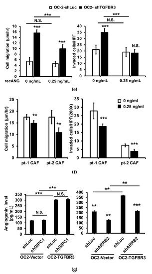 We hypothesized that secretary cytokines from TGFBR3-overexpressing OC-2 cells exert their effects on the stromal cells. To test this, we compared the secreted protein profiles of CM prepared from TGFBR3-overexpressing OC-2 cells (Figure 7a, top) to those collected from TGFBR3-depleted OC-2 cells (Figure 7a, bottom) by using a cytokine antibody array. We found that the alterations of TGFBR3 expression significantly influenced the levels of three cytokines, MCP-1, CCL20, and angiogenin (ANG) (Figure 7a, right). However, only ANG was concordantly expressed with that of TGFBR3. ELISA was used to validate the concordant correlation between TGFBR3 and ANG in the CM derived from TGFBR3-manipulated OC-2 cells (Figure 7b, left) and OEC-M1 cells (Figure 7b, right). However, the effects of TGFBR3 on secreted ANG protein abundance was not observed in CAL-27 cells (Figure 7b, right). The ability of TGFBR3 to induce secreted ANG was further confirmed in SMAD4-positive 293T cells (Figures S7 and S21). We next tested whether TGFBR3-mediated tumor-suppressive function depends on ANG. We found that inhibition of ANG by shRNA knockdown in TGFBR3 stably-expressed OC-2 cells significantly decreased secreted ANG protein (Figure 7c, left) and abolished TGFBR3-dependent inhibition of OC-2 cell migration and invasion (Figure 7c, right). The addition of anti-ANG antibodies similarly blocked TGFBR3-dependent inhibition of migration and invasion of OC-2 cells (Figure 7d). Furthermore, while the addition of recombinant ANG (recANG) protein partially attenuated TGFBR3 knockdown-induced cell migration, it completely blocked the invasion of TGFBR3-depleted OC-2 cells (Figure 7e). Exogenous ANG also suppressed CAF migration and invasion (Figure 7f). These data indicated that secreted ANG induced by TGFBR3 exerts its suppressive effects on the migration and invasion of OC-2 oral cancer cells and CAFs. We further dissected the role of ARRB2 and GIPC1 in TGFBR3-mediated secretion of ANG and found that only loss of ARRB2, not GIPC1, had significant effects on the secreted ANG abundance (Figure 7g).