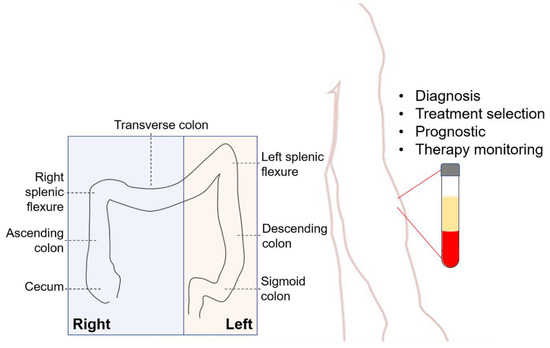 Colorectal carcinoma (CRC) is categorized based on its anatomic location. Right CRC (RCC) is localized in caecum, ascending colon or two proximal thirds of transverse colon. Left CRC (LCC) is defined as CRC in distal third of transverse colon, descending colon, sigmoid colon, or rectum. Clinical applications of the liquid biopsy in CRC include diagnosis, treatment selection, prognostic, and therapy monitoring.