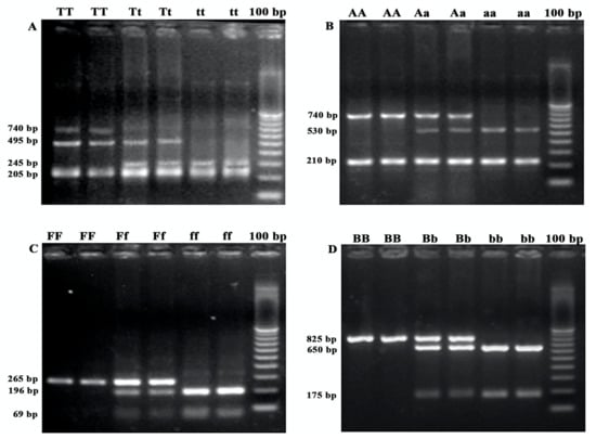 PCR-RFLP representative agarose gels of different SNPs of the (A) TaqI (TT, Tt, tt), (B) ApaI (AA, Aa, aa), (C) FokI (FF, Ff, ff) and (D) BsmI (BB, Bb, bb), respectively.