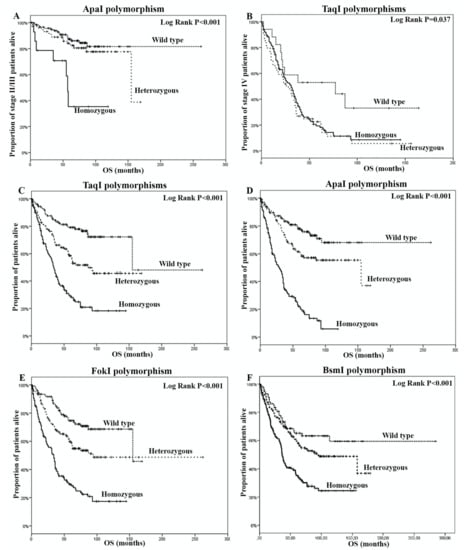Overall survival according to the detection of (A) ApaI polymorphisms and (B) TaqI polymorphisms in stage II/III patients, and (C) TaqI polymorphisms, (D) ApaI polymorphisms, (E) FokI polymorphisms and (F) BsmI polymorphisms in stage IV patients.