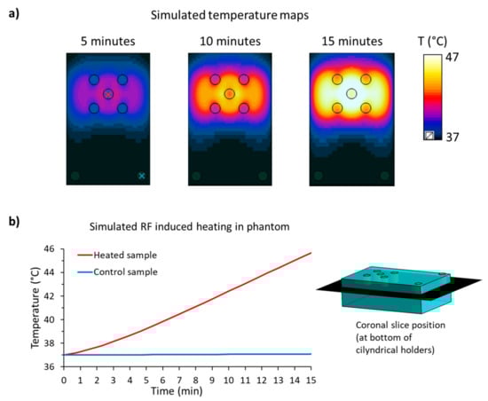 Electromagnetic and temperature simulations were performed to demonstrate the feasibility of the phantom setup for thermal intervention. The temperature maps obtained from the electromagnetic and thermal simulations of the phantom using a background temperature of 37 °C yielded T = 43 °C (time = 11 min, Pavg = 100 W) for the middle sample holder, where the loaded thermoresponsive nanogel solution would be placed (Figure 1). The temperature obtained for the controlled sample holder remained constant at T = 37 °C. This confirmed the suitability of the phantom design for carrying out RF heating experiments in an MR system.