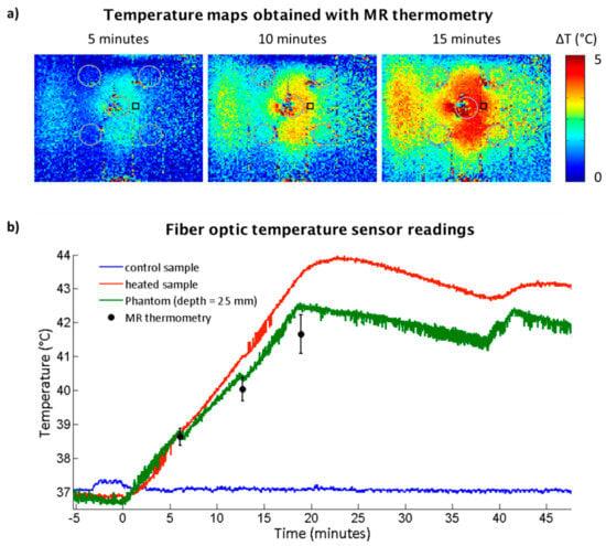 Following the simulation study, an experimental study was performed to demonstrate the feasibility of the phantom setup for thermal intervention. For this purpose, temperature changes induced in the experimental phantom due to RF heating were accessed with readings from fiber optic temperature sensors and with MR thermometry (MRTh) and are displayed in Figure 2.