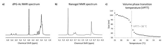 (a) 1H-NMR spectrum of acrylated dendritic polyglycerol (dPG-Ac). (b) 1H-NMR spectrum of the nanogels confirming its constitution. (c) Nanogel size vs. temperature curve obtained by dynamic light scattering (intensity). The VPTT defined as the temperature of the inflection point of this curve is 38 °C.