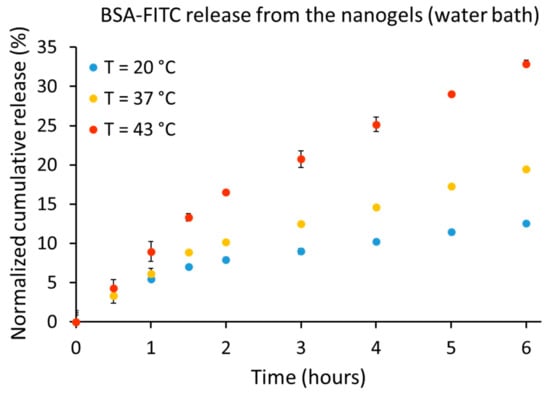 An initial evaluation of the release profile of the BSA-FITC was assessed using a water bath as a heat source. The above-mentioned nanogel loaded with BSA-FITC was diluted with a buffer (PBS, pH 7.4) to a final concentration of 1 mg/mL of the nanogel. Three Vivaspin filters (Vivaspin 500, Sartorius AG, Göttingen, Germany), each with 400 μL of the diluted solution, were placed in the water bath at 20 °C (room temperature), 37 °C (body temperature) and 43 °C (hyperthermia temperature). The filters were wrapped with parafilm to avoid contact with the water of the water bath. At certain time intervals, the samples were centrifuged (10 min, 4800 × g) and the filtrates were taken for analysis (fluorescence at λex/λem = 490/525 nm) while the same volume was replaced with a fresh buffer. The filters were weighed before and after centrifugation to calculate the buffer volume to be replaced.