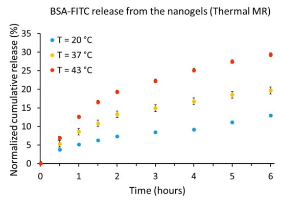The release profile from the nanogels using ThermalMR and RF heating as a heat source is shown in Figure 5. Using BSA-FITC as a model drug and the indicator for drug release, we found that at room temperature of T = 20 °C (18 °C lower than VPTT = 38 °C), the release of the BSA-FITC from the nanogels was 12.9% after 6 h. At T = 37 °C (1 °C less than VPTT, nanogels partially shrunken), the release of the BSA-FITC from the nanogels was increased to 19.6% after 6 h. At T = 43 °C (5 °C higher than the VPTT, nanogels fully shrunken) the release of the BSA-FITC from the nanogels was raised to 29.3% after 6 h.