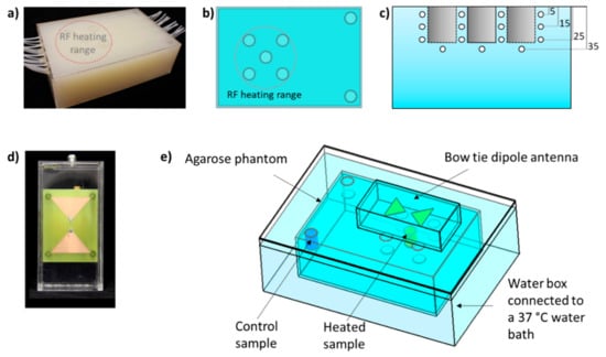 (a) Photograph of the agarose phantom with sample holders. (b) Schematic of the phantom (top view) with five sample holders located within the RF heated area and two outside for control purposes. (c) Schematics of the phantom (frontal view) depicting the positioning of the polytetrafluoroethylene (PTFE) tubes for the insertion of fiber optic temperature sensors. The PTFE tubes were placed at each side of the sample holders (please note that the holders are not all in the same plane) at a depth of 5, 15, and 25 mm and at the bottom of the holders at a depth of 35 mm). (d) Photograph of the bow tie dipole RF antenna. (e) Setup for the electromagnetic field and temperature simulations. The phantom was placed inside a water box with a background temperature of 37 °C, and a bow tie dipole RF antenna was placed on top, centered in the heated sample.