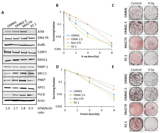 There are limited data available analyzing the radiosensitivity of UM cell lines to both protons and photons, and the relationship to DNA repair protein expression. Therefore, we first analysed the levels of key proteins involved in DNA base damage and single strand break repair (poly(ADP-ribose) polymerase-1, PARP-1; X-ray repair cross-complementing protein 1, XRCC1, polynucleotide kinase phosphatase, PNKP and AP endonuclease 1, APE1) and DNA DSB repair (Ku86, DNA-Pk, ATM, ATR, 53BP1 and RAD51) in extracts from four UM cell lines derived from primary (Mel270 and 92.1) and metastatic (OMM1 and OMM2.5) tumors. Variability was observed particularly in the levels of ATM, XRCC1, PNKP and Pol β between the cell lines (Figure 1A; Figures S1 and S2). However, it was noticeable that OMM2.5 and Mel270 contained higher levels (~1.7–6.0-fold) of ATM compared to OMM1 and 92.1. There was no apparent correlation between differential protein levels and whether the UM cells were derived from a primary (Mel270 and 92.1) or metastatic (OMM1 and OMM2.5) tumor.