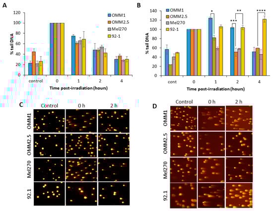 We analyzed the comparative kinetics of DNA DSB repair in UM cell lines in response to photon and proton irradiation using neutral comet assays. We observed in response to photons that, surprisingly, all the four UM cell lines analysed (OMM1, OMM2.5, Mel270 and 92.1) were able to largely repair DSBs within a 4 h period post-irradiation (Figure 2A,C). The cell lines also contained similar levels of DSBs at 1–2 h post-irradiation, even though these display differences in overall radiosensitivity to X-rays (Figure 1B). Whilst the repair efficiencies of the UM cell lines was similar, there were slight differences in the relative levels of DSBs induced immediately post-irradiation with X-rays, particularly in OMM2.5 cells which displayed reduced DSB levels (Figure 2C; compare time 0). However, in response to proton irradiation, the cell lines appeared to show differences in their ability to efficiently perform DSB repair. In fact, the OMM1 cells displayed ~1.4–2.1-fold higher levels of DSBs at 1 and 2 h post-irradiation compared to OMM2.5 and Mel270 cells (Figure 2B,D). Additionally, the 92.1 cells also contained ~1.2–1.8-fold, and ~1.8–2.7-fold higher DSB levels at 1 h and 2–4 h post-irradiation, respectively, compared to OMM2.5 and Mel270 cells (Figure 2B,D). This demonstrates that OMM1 and 92.1 have reduced capacity to perform DSB repair following proton irradiation, which correlates with these cell lines being the most radiosensitive to this radiotherapy modality.