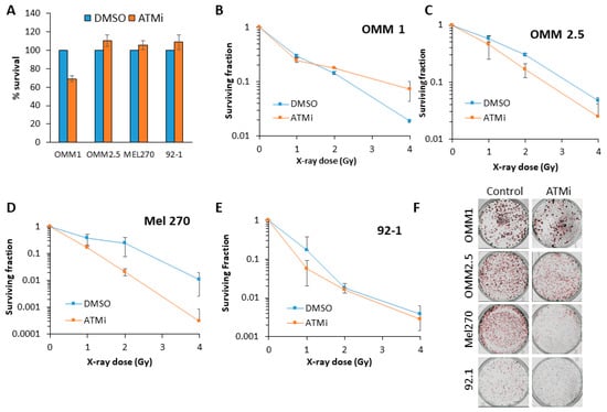 Comparative radiosensitivity of UM cells in the presence of ATM inhibition, following X-ray irradiation. The clonogenic survival of UM cells with (A) ATM inhibitor alone, or (B–F) following treatment with increasing doses of X-rays was analyzed from three independent experiments. (B–E) Shown is the surviving fraction ± S.E. (F) Representative images of colonies in non-irradiated and irradiated (2 Gy) plates (the latter were seeded with double the number of cells, accordingly).