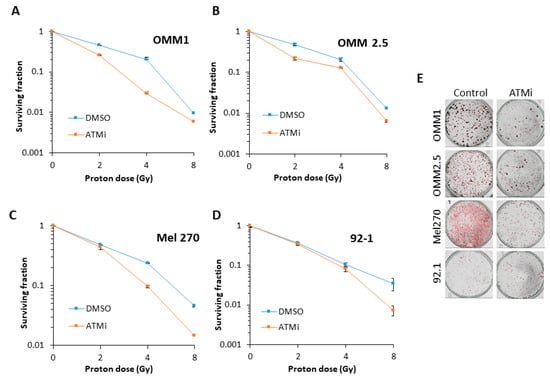 2.4. Targeting ATM can Increase the Radiosensitivity of UM Cells to Photon and Proton Irradiation