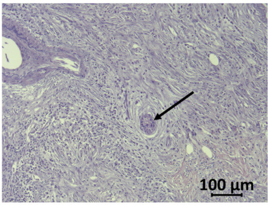 Haematoxylin/eosin-stained human PDAC sample. Tumor cells (arrow) are surrounded by the desmoplastic reaction of stromal cells and few immune cells.