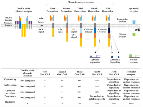 - Tokarew, N.; Ogonek, J.; Endres, S.; von Bergwelt-Baildon, M.; Kobold, S. Teaching an old dog new tricks: Next-generation CAR T cells. Br. J. Cancer 2019, 120, 26–37. [Google Scholar] [CrossRef]