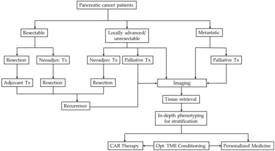 Strategy flow chart for PDAC therapy. Pancreatic cancer patients are classified into one of three categories upon diagnosis. Therapy (Tx) is chosen on the basis of this classification. In case of later stage PDAC or recurrent tumor, personalized medicine approaches could be of use. Imaging of patients would be followed by tissue retrieval to perform in-depth phenotyping of the tumor and its stroma. This could be performed by the application of up and coming technologies such as patient-derived organoids analysis, RNA-Seq or multiplex immunofluorescence staining. All in all, such refined selection criteria enables the balanced and careful stratification of patients into further effective and safe therapy paths, including personalized therapy approaches, such as CAR T cell therapy, with or without conditioning of the tumor microenvironment.