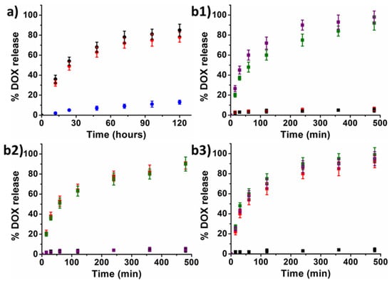 Release kinetics of the different formulations. (a) Release kinetics of the electrostatically immobilized doxorubicin (DOX) (circles) were studied by dispersing MF66-DOX in water (blue), PBS buffer (pH 7.4) (black), or sodium acetate buffer (pH 4.7) (red). (b) Release kinetics of the covalently immobilized DOX (squares) were studied by dispersing MF66-S-S-DOX (b1), MF66-I-DOX (b2), or MF66-S-S-I-DOX (b3), in PBS buffer (pH 7.4) containing 1 μM (black) or 1 mM of 1,4-dithiothreitol (DTT) (purple), or sodium acetate buffer (pH 4.7) containing 1 μM (red) or 1 mM of DTT (green).
