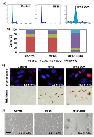 Since the proliferation of surviving cells after DOX treatment was not observed, we proceeded to perform a test of cellular senescence based on the overexpression of senescence-associated β-galactosidase enzyme in the samples. The results show positive blue staining indicating senescence in almost half of the treated cells with MF66-DOX, with higher occurrence in the largest cells (Figure 3d).