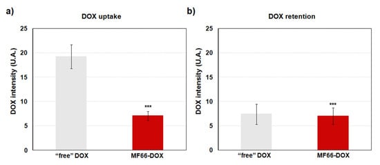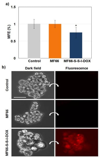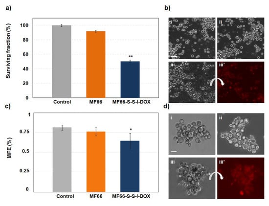 As observed in Figure 2a, a decrease in cell viability was observed in samples treated with MF66-DOX (53.0% ± 4.3%). However, the cytotoxicity induced by free DOX was clearly higher (see Figure S1 of the Supplementary Material).