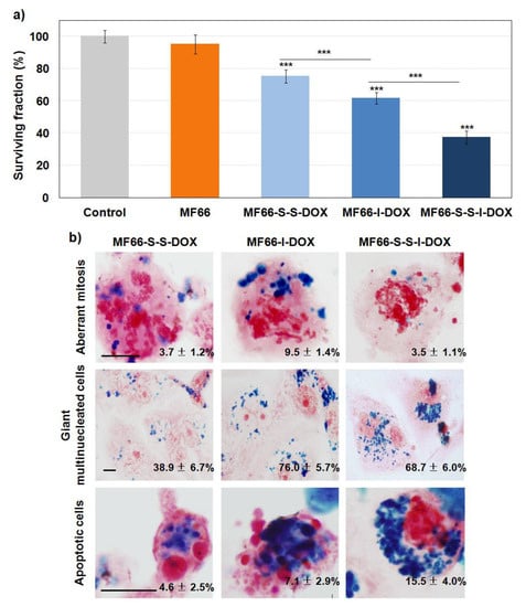 A detailed study by differential interference contrast (DIC) microscopy allowed us to detect several morphological alterations in cells treated with MF66 covalently conjugated with DOX (Figure S1b). Prussian blue staining corroborated these results (Figure 5b). At this long post-incubation time, the mitotic index was tripled in MF66-I-DOX-treated cells in respect to control cells and aberrant mitosis was observed after incubation with this nanoformulation. Another relevant finding was the increase in multinucleated and giant cells. In addition, features of apoptosis (cell shrinkage, condensation, and fragmentation of nuclear chromatin) were also observed when the cells were treated with the three different samples, but mainly with MF66-S-S-I-DOX.