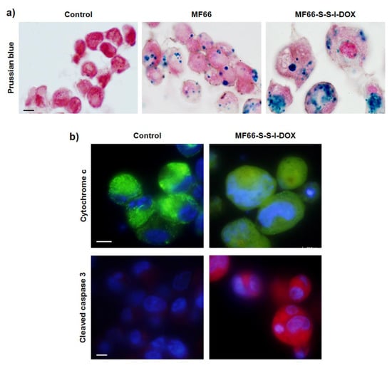 Morphological characterization and cell death mechanism triggered in mammospheres from MDA-MB-231 cells. (a) Prussian blue staining in control cells or treated with MF66 or MF66-S-S-I-DOX MNPs and visualized by bright field microscopy. Scale bar: 5 μm. (b) Immunofluorescence for cytochrome c (green) and DNA staining (blue) visualized by fluorescence microscopy. Scale bar: 5 μm. (c) Immunofluorescence for cleaved caspase 3 (red) and DNA staining (blue) visualized by fluorescence microscopy. Scale bar: 5 μm.