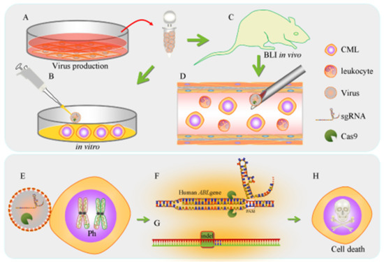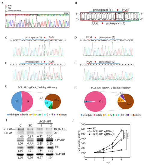 The following are available online at https://www.mdpi.com/2072-6694/12/6/1399/s1, Figure S1: Optimization of viral transduction conditions for human K562 cells, Figure S2: The TIDE algorithm analysis of BCR-ABL gene-targeted virus infection, Figure S3: The original TIDE algorithm analysis of ABL gene-targeted virus infection, Figure S4: Cas9 protein production and purification, Figure S5: The TIDE algorithm analysis of mABL gene-targeted virus infection, Figure S6: The representing mouse ABL disruptions of leukocyte and internal organs from SC- and mABL sgRNAs virus introduced mice, Figure S7: Hematology analysis of SC- and mABL sgRNAs virus injected mice. File S1: Complete sequencing results in .ab1 format. File S2: Original whole blot.