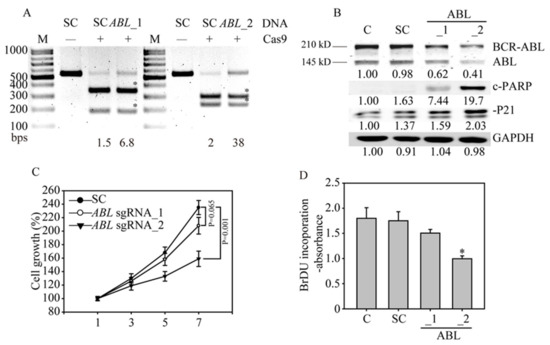 ABL gene disruption inhibits cancer cell growth and induces apoptosis in K562 cells. (A) The ABL gene in K562 cells was analyzed with RNA-guided engineered nuclease-restriction fragment length polymorphism (RGEN-RFLP) assays to measure the gene editing efficiency. The gel image of ABL gene cleavage induced by addition of specific sgRNA, and Cas9 shows the indel percentage in the gene editing pool. Cleaved DNA fragments are highlighted with an asterisk. (B) Western blot analysis of BCR-ABL and ABL protein expression. Bands at 210 kDa and 145 kDa, corresponding to BCR-ABL and ABL, were observed in the parental and SC sgRNA control K562 cells, whereas these bands were significantly reduced in the ABL sgRNA_1- and ABL sgRNA_2-transduced K562 cells. The protein expression of downstream ABL targets, such as P21 and cleaved PARP (c-PARP), was also activated by ABL gene redundancy. All the western blotting was measured and quantified by Image J software. (C) Cell viability curve of the ABL sgRNA_1- and ABL sgRNA_2-transduced K562 cells determined by MTT assays. (D) Cell proliferation of the ABL sgRNA-transduced K562 cells was determined by bromodeoxyuridine (BrdU) incorporation assays.