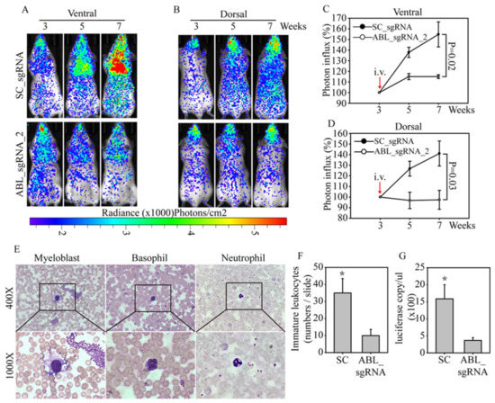 To evaluate the therapeutic effects of ABL disruption in vivo, we established a systemic leukemia animal model to evaluate the anticancer effect of an ABL-targeted CRISPR/Cas9. Luciferase-labeled human CML K562 cells were purified and expanded under normal culture conditions. SCID mice were injected with luciferase-labeled K562 cells through the tail vein. After three weeks, the mice were grouped and then injected via the tail vein with the SC- or ABL sgRNA_2-targeted CRISPR/Cas9 virus. The bioluminescence in each mouse was detected ventrally (Figure 4A) and dorsally (Figure 4B) every two weeks, to evaluate changes in leukemia cell number. The bioluminescence images clearly showed strong K562 cell growth in animals injected with the SC-targeted CRISPR/Cas9 virus from week 3 to week 7, especially in the ventral images of the heart and brain (blood-enriched organs). However, in mice treated with the ABL-targeted CRISPR/Cas9 virus, the K562 cell number only slightly increased in the ventral and dorsal bioluminescence analyses. Radiance photon measurements were used to calculate the cell number in each mouse, and the K562 cell growth curve showed significantly greater growth in the SC group than in the ABL-targeted group in both the ventral (p = 0.02, Figure 4C) and dorsal (p = 0.03, Figure 4D) analyses. Notably, this leukemia animal model not only mimics a gene therapy application in CML patients but also indicates that one course of ABL-targeted CRISPR/Cas9 virus treatment is sufficiently effective to suppress leukemia cell growth. To confirm the bioluminescence observations, we stained peripheral blood smears from the SC and ABL groups (Figure 4E). Myoblasts and neutrophils are shown at 400× and 1000× magnification; the smears showed a significant difference in the immature differential white blood cell count in the SC and ABL groups, with average values of 35 and 9, respectively (p < 0.05, Figure 4F). In addition, enhanced platelet aggregation and an increased basophil number were found in the SC group, mirroring the clinical diagnostic features of CML patients. Finally, we purified DNA from the peripheral blood of mice in the SC and ABL groups. Absolute quantification of the DNA was performed with luciferase-specific primers, and the results were normalized to the mouse GUS gene copy number in the qPCR analysis (Figure 4G). Again, the data showed significantly higher luciferase gene (carried by the CML cells) expression in the SC-targeted CRISPR/Cas9 virus-treated mice than in the ABL-targeted CRISPR/Cas9 virus-treated mice, indicating a strong therapeutic effect of ABL-targeted gene therapy in a systemic animal model of human leukemia.