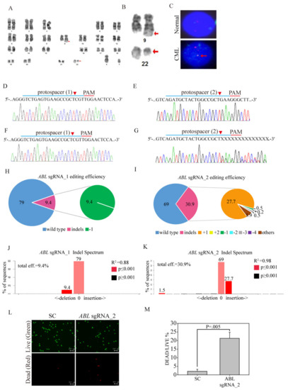 To evaluate whether ABL-targeted gene editing can be used as an antileukemia therapy in the clinic, we infected the peripheral blood mononuclear cells (PBMCs) of CML patients with the ABL sgRNA_2-targeted CRISPR/Cas9 virus. The patient was a 49-year-old male who had lost 10 kg of body weight within one year, and complained of a low-grade fever, early satiety and loss of energy. The laboratory examination of this patient showed normal values for GOT, GPT, creatinine, AFP, CEA and CA199. However, the hematology analysis showed that RBC, lymphocyte and monocyte counts were far below average, with poor RBC quality, as shown in the HGB and HCT measurements. The WBC count was 320.8 × 103/μL (normal range is 4.8–10.8 × 103/μL), and the WBC differential count identified 12% band cells, 8% metamyelocytes, 4% promyelocytes and 5% blasts of all immature leukocyte stages in peripheral blood. Conventional cytogenetic analysis of products of conception revealed, at a 400 G-band level of resolution, an abnormal karyotype 46, XY, t(9;22)(q34;q11.2) (Figure 5A). Clear karyotypes of chromosome 9 and chromosome 22 are also shown (Figure 5B). To further confirm the chromosomal translocation, we performed a FISH analysis of the patient through the hybridization of combined probes targeting chromosome 9 and centromere 22 (Figure 5C). Our data revealed that the “fusion” signal resided on the derived chromosome 9 and not on the derived chromosome 22, as would typically be expected in CML with one isolated fusion signal. Next, we investigated the efficacy of CRISPR/Cas9 genome editing in clinical CML cells by SC, ABL sgRNA_1 and ABL sgRNA_2 virus infection with the optimized virus concentration. The CML cells transduced with or without the SC virus produced a wild-type ABL sequence, as shown by Sanger sequencing (Figure 5D,E), with no evidence of gene editing. However, transduction with the ABL sgRNA_1 or ABL sgRNA_2 virus led to multiple gene disruptions at the predicted cleavage sites (red arrowhead) of both protospacers, with more pronounced effects in ABL sgRNA_2-transduced CML cells than ABL sgRNA_1-transduced CML cells (Figure 5F,G). In addition, ABL sgRNA_2 virus infection was shown to have strong gene editing efficiency by TIDE analysis: 30.9% of the cell pool was edited, rather than 9.4% with a 1-bp deletion in ABL sgRNA_1 virus infection (Figure 5H–J). The most frequent mutations in the ABL sgRNA_2 CML cell pool were 1-bp insertions (27.7%) and other mutations (1.9%) (Figure 5K). Next, we used a LIVE/DEAD assay to visualize apoptosis induced by CRISPR/Cas9 genome editing of ABL in clinical CML cells (Figure 5L). The images showed a significant increase in the number of cells undergoing apoptosis after transduction with ABL sgRNA_2 (21.3%±4.65, apoptosis cell percentage), compared to that of SC (2.1% ± 1.2, apoptosis cell percentage)-transduced CML cells (Figure 5M, p < 0.05), indicating that the ABL-targeted CRISPR/Cas9 virus can be used an effective gene therapy strategy for clinical CML patients.