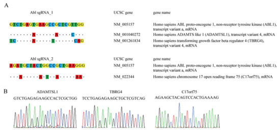 Off-target investigation of the ABL-targeted CRISPR/Cas9 system. (A) The CRISPR design website was used to predict off-target candidate genes for both the ABL sgRNA_1 and ABL sgRNA_2 viruses. Similarities are presented as dots, and mismatch sites are indicated by nucleotide substitution. (B) Sanger sequencing of the K562 cells infected with the ABL sgRNA_1 or ABL sgRNA_2 virus was used to examine potential indels in off-target candidate genes.