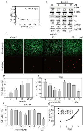 Imatinib inhibits K562 cell survival and induces apoptosis. (A) The IC50 values of the control or imatinib in K562 cells were determined using MTT assays after treatment for 48 h. (B) Imatinib significantly inhibited ERK activation and induced P21, P27 and cleaved PARP (c-PARP) protein expression in a dose-dependent manner, as evidenced by western blot analysis. All the western blotting was measured and quantified by Image J software. (C) The LIVE/DEAD cell viability assay was performed after imatinib treatment of K562 cells for 24 h. Cells were subjected to viability assays to identify live (green) and dead (red) cells at 100× total magnification (D) Cell death after imatinib treatment was analyzed for significance. Comparison of cell viability following imatinib treatment and ABL sgRNA virus infection of (E) K562 cells or (F) K562-IR cells. K562 or K562-IR cells were treated with 1, 10 or 25 μM imatinib or infected with ABL sgRNA_1 and ABL sgRNA_2 virus for 48 h. The cells were analyzed by MTT assays. (G) Cell viability curve of the ABL sgRNA_1- and ABL sgRNA_2-transduced HS27A cells determined by MTT assays. Data are presented as the mean and standard deviation. Data were analyzed with Student’s t-test; all P-values were two-sided. P values less than 0.05 are indicated with an asterisk.