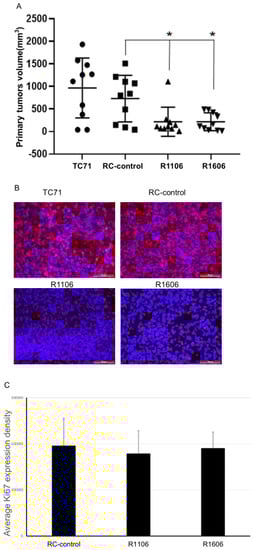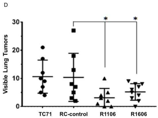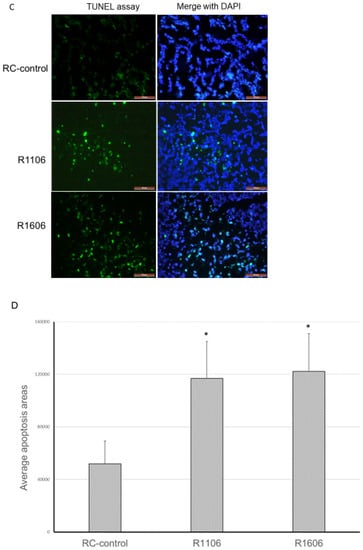 A terminal deoxynucleotidyl transferase dUTP nick end labeling (TUNEL) assay showed that apoptosis was also significantly increased in the R1106 and R1606 tumors compared with control tumors (Figure 6C,D).