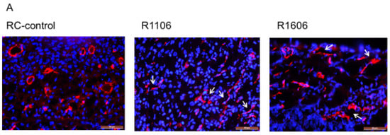 Tumor growth requires a robust functional vasculature. Since the growth of ES tumors in vivo was not explained by an effect on tumor cell proliferation, we next evaluated the tumor vasculature morphology in the R1106 and R1606 REST-KO and RC-control tumors, first by staining with CD31. Vessels in the RC-control tumors showed open lumens, whereas the vessels in the R1106 and R1606 REST-KO tumors had a punctate morphology (Figure 3A, white arrows).